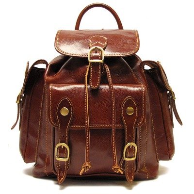 4051Brown Color: Vecchio Brown Features: -Constructed of Italian polished calf-skin leather. -Handmade in Florence. -Raw leather interior. -Two 16 oz. water bottle pockets 9" x 3" x 1.5". -Front gusset pocket: 7.5" H x 8" W x 1" D. -Dimensions: 14" H x 14" W x 9" D.