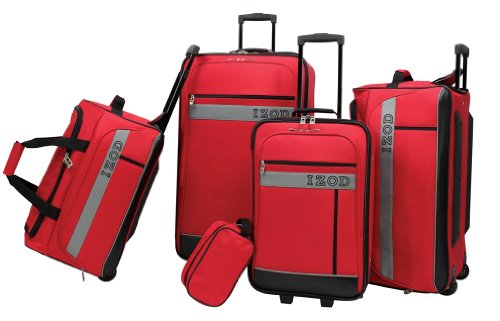 Izod's 5 pc set is a tremendous value!. made from tighly woven polyester fabric for durablilty. Set includes: 28 inch expandable upright, 28x17x10 inches, 9.3 lbs.; 20 inch carry-on,25x13.25x12 inches, 5 lbs.; 25 inch rolling duffel, 22.5x13.5x6.5, inches 6 lbs.; 20 inch rolling duffle, 20x11x11.5, inches 4.4 lbs.; 9 inch toiletry kit, 9x5x4 inches, 0.5 lbs. a lot of luggage at a terrific price!